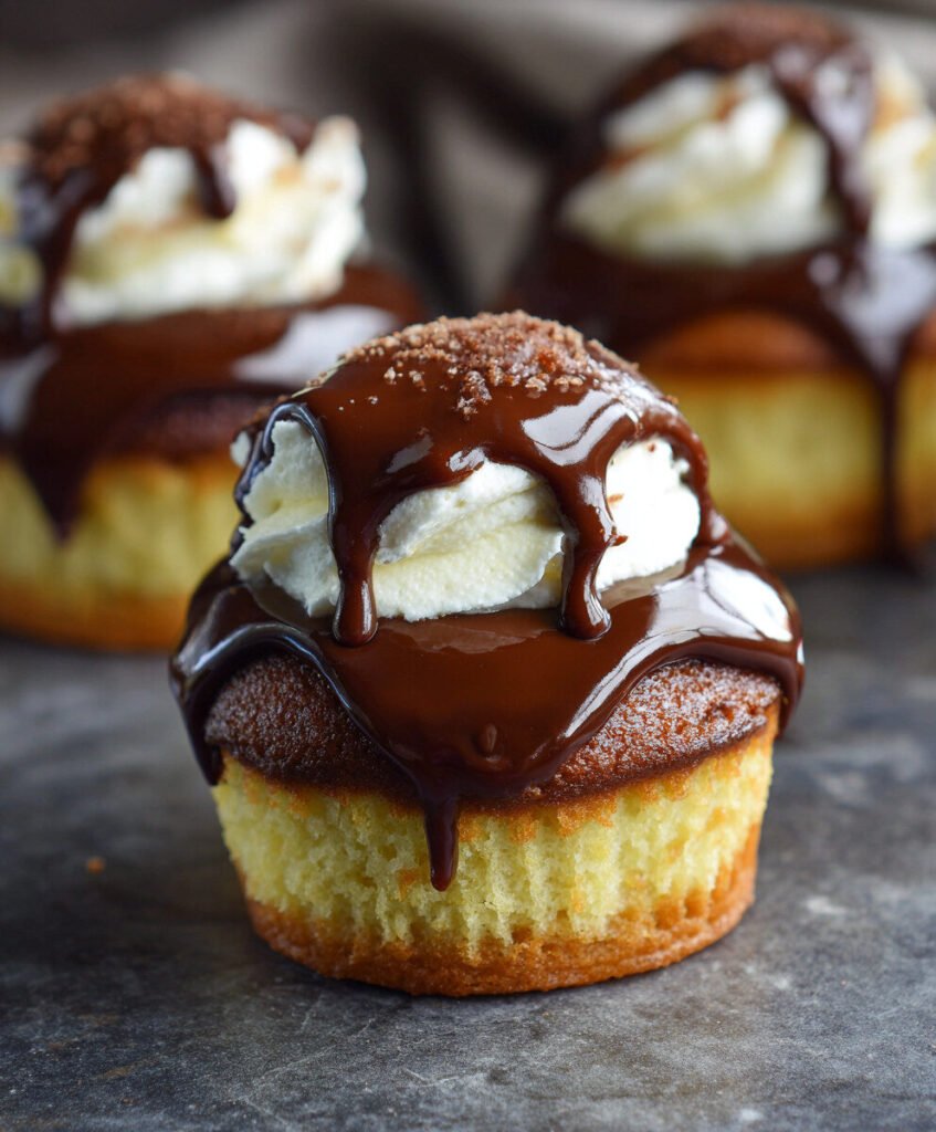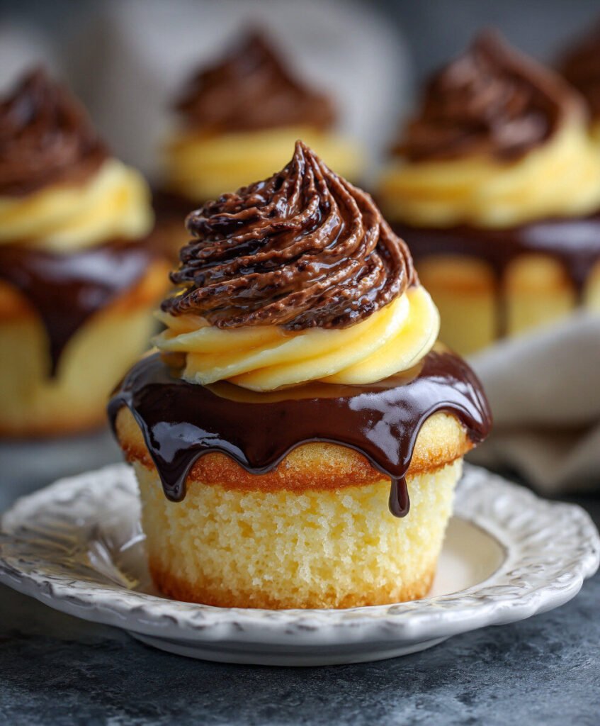 Imagine biting into a cupcake that’s secretly a Boston Cream Pie in disguise. Soft vanilla cake, creamy custard filling, and a glossy chocolate ganache—all in one handheld bite.