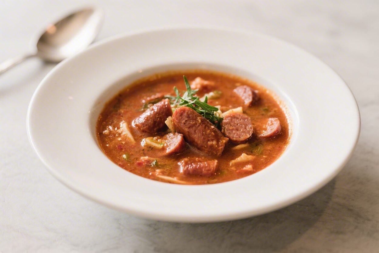 - A smart layering of aromatics. Onion, carrot, celery, and garlic soften in the sausage drippings, building a deep, savory base.