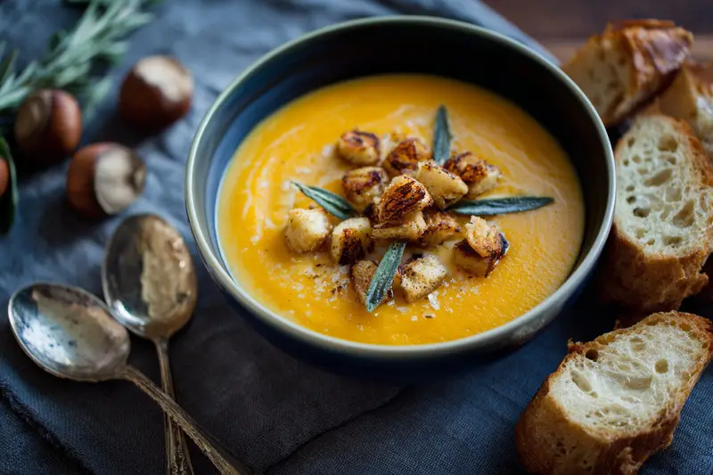 - Blend it all: Add roasted squash and broth, simmer for 5 minutes, then blend until smooth.