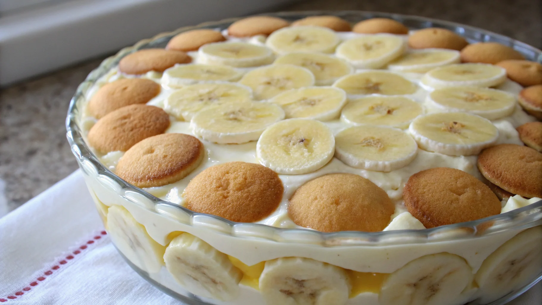 - Layer 1: In a 9×13-inch dish (or trifle bowl), add a snug layer of vanilla wafers.