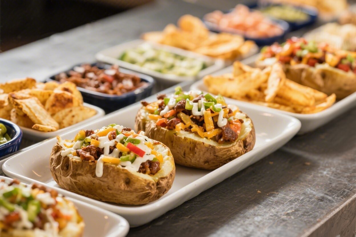 - Serve: Arrange potatoes in a warm dish or chafing pan.Place toppings in a buffet line from base layers (butter, cheese) to proteins, veggies, sauces, and finishing touches.
