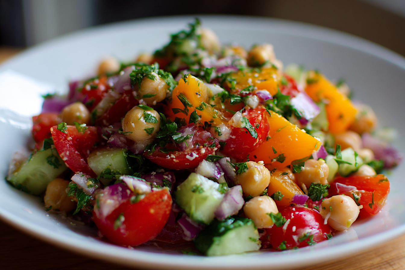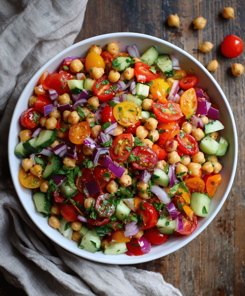 This isn’t just another salad. It’s a texture party—crunchy cucumbers, creamy avocado, juicy cherry tomatoes, and crispy chickpeas all in one bite.