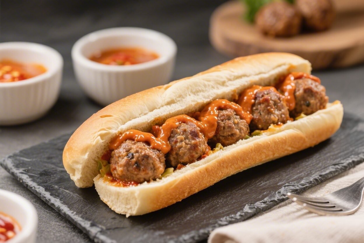 - Assemble the subs: Spoon a layer of sauce onto each roll. Nestle 3–5 meatballs inside (depending on roll size). Spoon more sauce over the top.